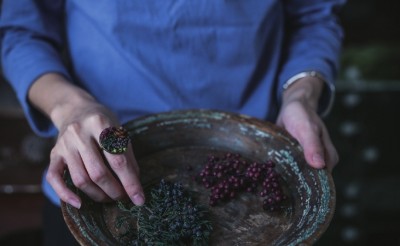 茹萍选择山林的另一个重要原因,是因为植物。这个喜欢色彩与鲜活生命的女生,天生就与植物有斩不断的联系:“就是喜欢呐。不是植物在吸引我,是我主动去喜欢它。”于是,茹萍常常背着那只由多余的废纸篓改造而来的背篓,外出山林采集植物。捡来的植物需要在清洗后,在太阳下暴晒,这样能够延长植物的保质期。采集来的叶子、果实风干,可制成花环和发饰,一圆心中多年的公主梦。山中的一块小木料,也可能成为一枚独一无二的戒指,不过,木料的选择也有讲究,木质太柔软,不易成型,而有些木质易碎,就不适宜日常佩带。任何植物,只要心思独到,就能够成为与平日截然不同的模样。而有时,一株植物,一念之间,就可以是一整座森林。茹萍曾经在山中采撷了一些玉米,一开始只想将玉米风干,并没有构思任何作品,但是在风干的过程中,却意外发现玉米的苞叶很美,细腻的纹路既有植物的鲜活,又像是常用来折纸的皱纸。于是,茹萍便将玉米的苞叶单独处理,通过剪裁成不同宽度,弯曲成不同的弧度,从而比拟荷花、蔷薇、菊花的花瓣。玉米粒晒干之后,颜色更加深一些,黏合在一起,就像是一簇盛放的小球菊。