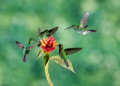 蜂鸟并不怕人,距离人类四五米的距离,它都不会飞走,有时甚至会停留在三脚架上,或者人们把玩的手机上,相当的“胆大妄为”。所以,拍摄蜂鸟时,你压根不需要做伪装,甚至和同伴聊天都可以。当很多只蜂鸟,同时相中了一支花朵,战争场面一触即发。宋鹤鸣就看到过这样精彩的打斗场面,一只蜂鸟气势汹汹,赶走了四五只不同种类的蜂鸟,等它自己占地为王之后,却并不急着去吃花蜜。“有些时候,它们并不是为了争抢花蜜而打架,完全就是为了打架而打架。”于是,大家想出了一个办法,向导拿出浇花的喷枪,蜂鸟一飞来,就喷它,喷了很多次之后它才不来了。也有几只特别执着的蜂鸟,纵使你怎么喷它,都喷不走。只能上棍棒,继续赶它走。而蜂鸟之间的战役,更是精彩绝伦,两只鸟对打起来,可以上天入地,在地上连翻几番,那场面绝不亚于精彩的泰拳比赛。