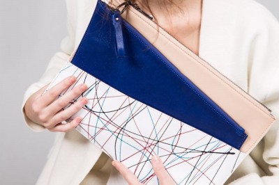 这款手包采用蓝、白、粉的拼色,充满了动感与活力。其中彩绘部分,特意采用环保AB胶来呈现了波洛克的滴画式艺术手法,随着身体的自由摆动,不同的颜料在皮面上随意的泼洒、滴流,创造出纵横交错的抽象线条。中间的蓝色部分可取出做为单独的手包使用。