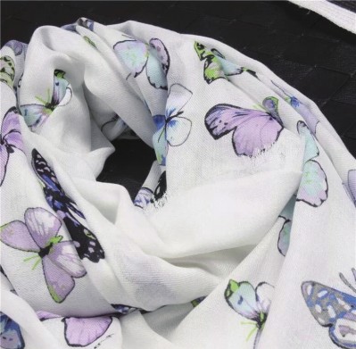 不同于纯色围巾,这款围巾运用了蝴蝶的花纹。纯色围巾,虽然更百搭干练,但是印有花色的围巾,搭配腰带,或其他配饰,却能玩出不同“花样”。