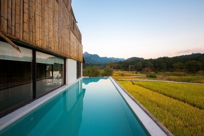 设计之初,吕鲲鹏先描摹了一种生活状态:田园秘境,享受慵懒的慢生活。而在南朝诗人谢灵运笔下,就是“清旦索幽异,放舟越垧郊”的山水长卷。楠溪江还是“耕读文化”的发源地,远离喧嚣、寄情山水、陶情冶性的耕读生活也是都市人返璞归真的精神寄托。“我们向往田园生活,希望周围被自然美景包围,最好乡村里还有个大泳池,属于自己的泳池,虽然不经常游泳,光看看蓝色,心情也豁然开朗。”