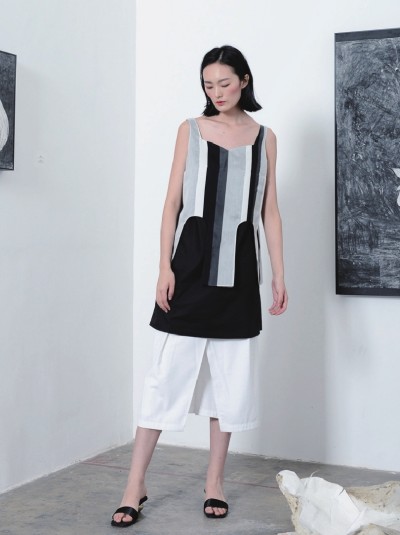 黑白色系的线条拼接,简单的线条雕塑立体的结构感,飘逸的面料展现独树一帜的设计师风格。及膝的上衣搭配宽松的白色下装,慵懒随性,将俏皮与性感集于一身。