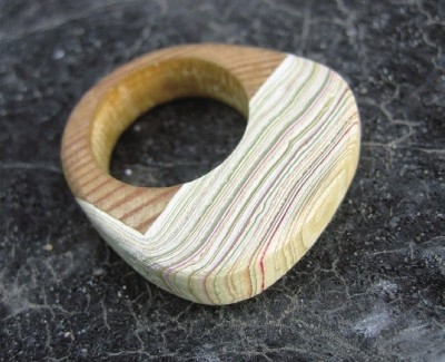 这款戒指采用纯手工,由旧的绘画桌雕刻而成。不同色彩的层次由油漆刷制而成,层层叠叠的油漆用了4个月精心勾画,而其中的木头成分只是原绘画桌的一小部分。