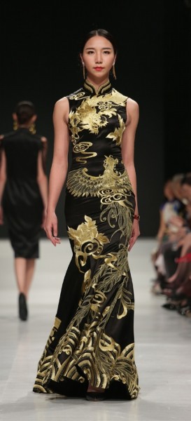 黑金龙凤礼服,高贵奢华。龙为九五之尊,凤为百鸟之王,这一对高于自然界物种的灵眷,盘旋于整件礼服之上,下面层层海浪呼啸翻滚,更是将龙凤托驾于九天之上,整件礼服,图案立体,无论从哪一个角度看去,都霸气十足。礼服用到了盘金绣的工艺,是平金绣的简化。以丝绣图案为依据,将金线回旋,加于已绣或未绣的图样边缘。