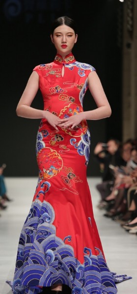 印象山水旗袍,细腻大气,怡然自得。运用到了手绘技艺,这是一种古老而又传统的艺术表现形式,其在现代旗袍设计中的运用,充分体现出艺术与技术的完美结合。以中国风元素为主题的手绘图案为主要切入点的设计思路,较好地平衡了中国古代传统元素和现代时尚旗袍设计之间的关系。