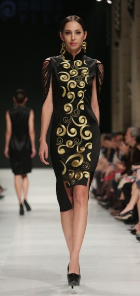 黑金色宝罗莉卡品牌Logo刺绣旗袍,前卫与传统的融合,碰撞出别样的海派魅力。设计师别出心裁地将宝罗莉卡的Logo图案以传统刺绣手法呈现,并结合现代流行元素之一的流苏,将海派文化的精髓体现得淋漓尽致。