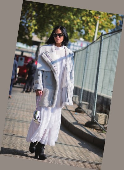 厚重的羊羔绒搭配轻薄的纱裙,既暖又仙。