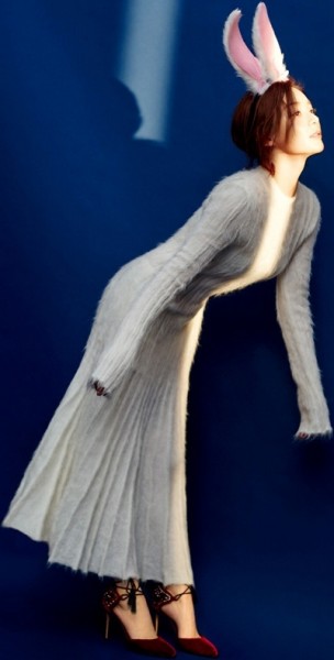 袁姗姗以一身白色毛绒连衣长裙带上萌萌兔耳朵登上时尚杂志封面,展现多面的率性与百变。