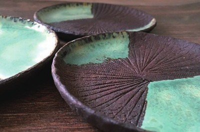 日式风格的饮食之器,往往承袭其空灵的“禅”文化之意。日式风格的食器,常常以陶、土、木作为食器的材料,成品之后,有时还能看见陶之粗粝,木之纹路。可是正是这番“不经雕琢”,却能让味蕾更加敏锐,集中在饮食的美上。这款以“荷叶”为形的盘,既可盛茶,也可放置一些小点心。所谓“入窑一色,出窑万彩”,每只陶器,自有其生命与纹路。