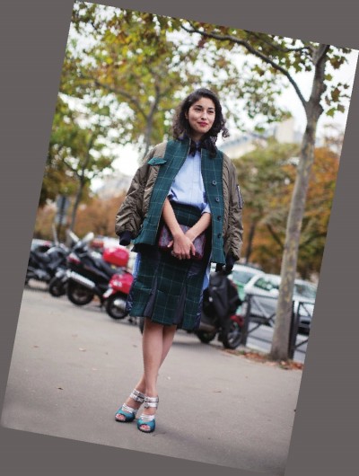 绿色格纹拼接羽绒棒球外套搭配同样材质的及膝裙,有谁能说不优雅呢?