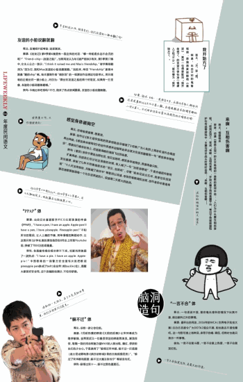 例句:各路魔性模仿根本停不下来。如麦当劳就跟了一波热点:“I have a pie. I have an apple. Apple-p i e!”中国香港的一段警方安全宣传片则把歌词pineapple pen换成了belt(安全带)和buckle(扣),提醒大家系好安全带。这个改编我给满分,不怕你骄傲。