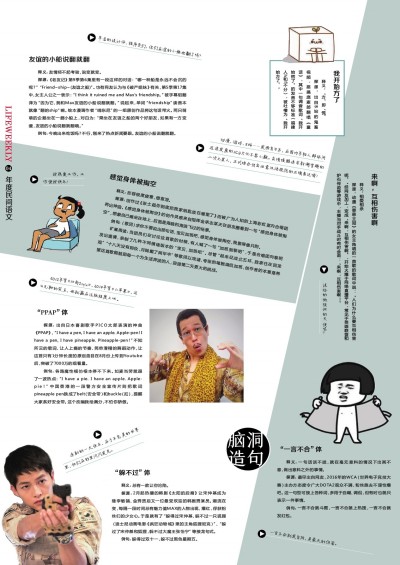 探源:出自日本喜剧歌手PICO太郎表演的神曲《PPAP》,“I have a pen, I have an apple. Apple-pen!I have a pen, I have pineapple. Pineapple-pen!”不知所云的歌词、让人上瘾的节奏、简单滑稽的舞蹈动作,让这首只有1分钟长度的原创曲目在8月份上传到Youtube后,突破了7000万的观看量。