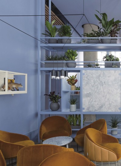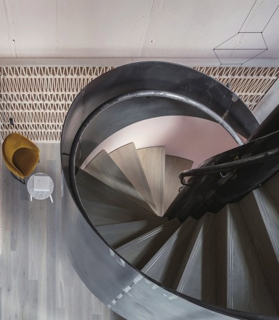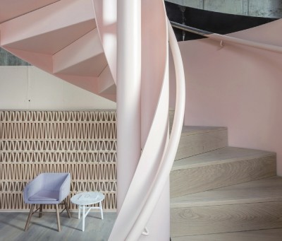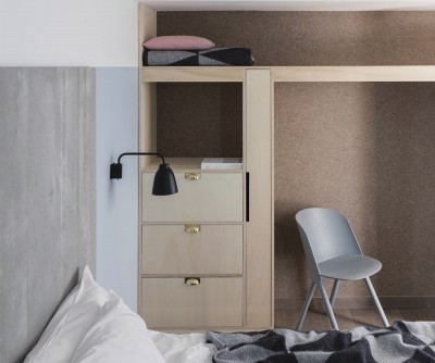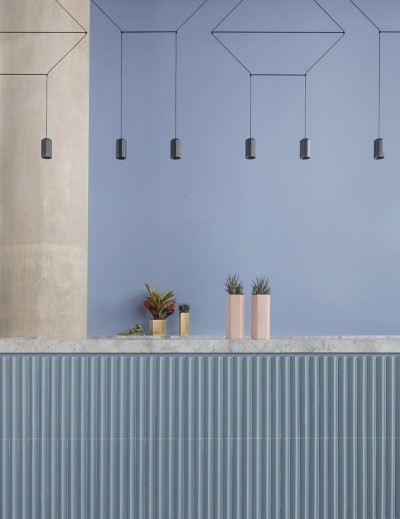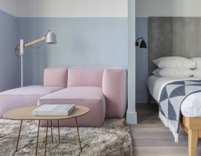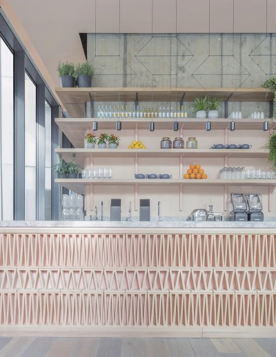 最近,你有没有被《你的名字》这部电影刷屏?凭借精致到像素的可观画质,这样一部动画片靠着一帧一帧的电影截图掀起了日本动画的观影狂潮。电影背后吸引人们的到底是什么?或许是导演对每一个画面色调的苛刻要求,或许是电影清新文艺的养眼配色,或许是电影中的风景有繁华的都市,有淳朴的乡野,有绚烂的天空。将所有柔和的颜色全部集中在同一部电影中,通过美好的视觉体验来博得观众的喜爱。如今,越来越多人更偏爱于暖色调的视觉享受,沉浸于温暖系所带来的家的感觉,而伦敦的Leman Locke酒店就将粉色和蓝色相接合,在一个空间中调和了黑色的刚硬、粉色的细腻、蓝色的冷淡,设计师希望通过颜色设计明媚整个冬天。 坐落于伦敦东部的Leman Locke酒店,通过结合今年PANTONE的两大流行色,将便利感和高品质搭配在一个空间中,为客人带来酒店未知新鲜感的同时,也为他们营造亲切如家般的感受。设计师在设计酒店时曾说,希望为那些因工作而居无定所的人打造一个兼具设计感和欢乐气氛的新型空间。酒店所在的建筑本身没有什么特别的亮点,难以利用空间构造本身打造出亮点,但设计师依旧对建筑结构进行了细微的调整,为室内空间的营造提供了更多有利条件。一楼本应完整的吧台与咖啡酒吧被电梯厅一分为二,然而利用灯具、色彩的一致性,使得空间再度合二为一,相互呼应。旋转楼梯的设计在空间中划出一道优美的弧线,利用颜色层层变化连接一二层的空间。落地玻璃的设计让室内酒吧的觥筹交错与玻璃外的光怪陆离互为风景。咖啡休息区的设置则选择了撞色的设计概念,大面积的蓝色为主色调,点缀着橘色的家具,绿色的植被以及刚硬的黑色吊灯,空间整体看起来更像是一个北欧风格的酒店。如果静谧蓝和粉晶相互结合带有一点点冰淇淋的甜腻感,那么在房间的色彩选择上,设计师同时选用了混凝土的自然和原木色的淡雅,刚好填补了色调的另一面,呈现出更为自然新鲜的感觉,天生一对的色彩在酒店中显示出温暖亲切的空间体验。空间的细节部分使用粉色木格作为整体的装饰元素,屏风由一个个交错重叠的木三角组合而成,为整个空间融入了更多细节,丰富了空间层次感。而静谧的淡蓝色时不时充当背景墙壁,在无形之中削弱了粉色系的浮夸。当然,每一间房间都有其独特的配色,而房门口贴心地贴上了专属于此房间的颜色色卡,让客人可以根据心情挑选色卡,选择相对应的房间。无论是咖啡吧的橘色沙发,还是孟菲斯派的床铺,甚至是线条感极强的灯具,设计中所使用到的家具都由设计师独立设计完成。设计师在创造出甜蜜温馨的酒店空间后,又打造了独特并且融合于空间的家具美学。