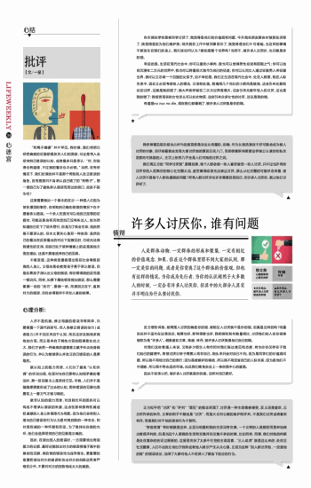 人是群体动物,一定群体的形成和聚集,一定有相近的价值观念,如果,你在这个群体里得不到大家的认同,那一定是你的问题,或者是你背离了这个群体的价值观。但也有这样的情况,当你成为先行者,当你的认识超然于大多数人的时候,一定会有许多人讨厌你,但其中的大部分人其实并不明白为什么要讨厌你。 程立勋 心融德瑞姆心理咨询师 ★正方观点:被许多人讨厌就是你的错 何瑞 作家 ▲反方观点:就让许多人讨厌好了 ★昨天我在学校里被同学讨厌了,我觉得是他们的价值观有问题;今天我在朋友聚会时被朋友厌恶了,我觉得是因为他们嫉妒我;明天我在工作中被同事排斥了,我觉得是他们不可理喻。当这样的事情不断发生在我们的身上,我们该如何认为?错的是整个世界吗?当然不,被许多人讨厌时,也只能是你的错。 幸运的是,生活在现代社会中,你可以喜欢小鲜肉,我也可以觉得男性应该有阳刚之气;你可以独自沉浸在二次元的世界中,我也可以将星辰大海作为自己的征途;你可以认同女人通过征服男人来征服世界,我可以立志做一个自强的女孩子。但不幸的是,我们正生活在现代社会中,处在人群里,陷在人际关系中,因此又必须考虑他人的想法、立场和处境。我痛骂几个当红的小鲜肉是娘炮,这会引来无数粉丝的讨厌,这就是我的错了;我大声疾呼躲在二次元世界是懦夫,这会引来无数年轻人的讨厌,这也是我的错了;我指责现在的女性怎么可以如此物质,这会引来众多女性的讨厌,这还是我的错。 有道是no zuo no die,现在我们都看到了,被许多人讨厌就是你的错。 ▲我经常看见娱乐板块占80%的版面都是攻击女明星的,的确,作为女演员演技不好可能会成为被人讨厌的对象,但仔细看就会发现大家讨厌她的原因五花八门,而即使像斯特里普这样被公认演技和私生活都无可挑剔的人,主页上依然几乎全是人们对她的讨厌之词。 我们用正方的“同学讨厌我”逻辑划算,每个人都会被一些人喜欢被另一些人讨厌,只不过也许有些讨厌你的人距离你的核心社交圈太远,甚至懒得或者无法表达讨厌,那么从社交圈的可能状态来看,被人讨厌不是每个人都会遇到的问题?所有人都讨厌你也许你需要反思自己,但许多人讨厌你,就让他们讨厌好了。 ★反方想告诉我,被周围人讨厌的确是你的错,被陌生人讨厌就不是你的错。但真是这样的吗?明星实在并不适合在这里谈论,杨幂也好,斯特里普也好,我相信和粉丝数量相比,讨厌她们的人实在很难被称为是“许多人”。倒是诸如文章、陈赫、林丹,被许多人讨厌就是他们自己的错。 对我们这些普通人来说,又有多少陌生人有空闲对我们表达意见和态度,有也往往仅存在于我们自己的臆想中。将被讨厌归咎于周围人而非自己,到头来只会对自己不利。因为是同学们的价值观问题,所以我不用检讨自己的言行;因为是被嫉妒的缘故,所以我不用反省自己的人际关系;因为是他们不可理喻,所以我不用去适应环境。由此我们难免会走上一条自我中心的道路。 因此不妨承认吧,被许多人讨厌就是你的错。这样对自己更好。 ▲正方似乎把“讨厌”和“评判”“冒犯”的概念弄混了,讨厌是一种主观情感感受,反义词是喜欢,正方所列举的林丹、文章的例子不能说是“讨厌”,而是大众对公德的维护和评判,不是我们讨厌或者喜欢林丹,而是我们对于他的某些行为不赞同。 “旁观者清”有时候就是这样,正因为明星和我的生活没有交集,一个正常的人是能轻而易举地做出客观评判的,但是当这个人跟我的生活有交集并且交集不多的时候,比如同学、同事,我们对他的判断是处在复杂的佐证过程里的,这里面夹杂了太多不可控的主观因素,“三人成虎”就是这么来的,处在泛社交圈里,人们不由自主地出于自保或者他人暗示产生从众心理,正因为这种“别人都讨厌他,一定是他的错”的错误结论,加深了大家对他人不经深入了解妄下结论的行为。