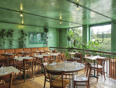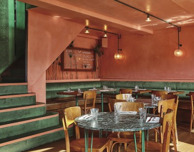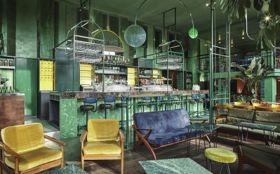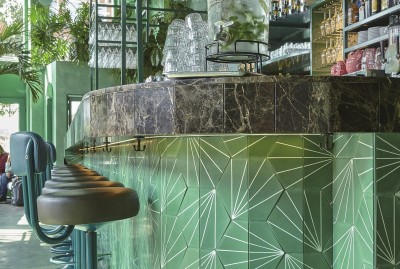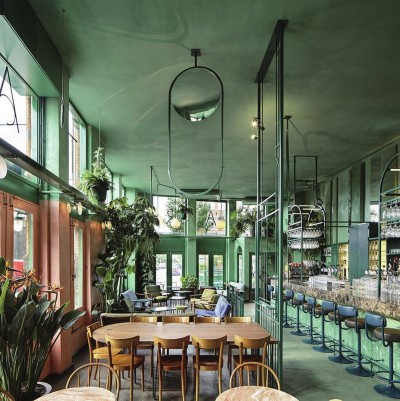 “静静地躺在草地上,看天空每一片云彩,把自己变成小草吧,去感受大地的温暖……”把自己融入大自然是很多人的向往,这似乎是全世界人们的共同爱好。而2017年的代表色恰巧是草木绿,就是大自然赋予生命的颜色,也是人们憧憬和热爱的颜色。 象征着新生与活力的草绿色在设计界掀起了一股“绿植风潮”。而草绿色调的墙面或者室内设计在吸引人注意力的同时,还能为室内增添自然的气息,植物能让人感到快乐,酒吧自然是工作之余放松自在的场所。位于阿姆斯特丹的Botanique酒吧便将这两种元素相结合,有如都市中的绿野仙踪。它在街角营造出热带雨林般的梦幻,植物不是装饰酒吧可有可无的点缀,而是真正与酒吧浑然一体,酒吧如同一片热带雨林凝聚了新鲜空气,在街角隐匿。 由Studio Modijefsky设计的Botanique酒吧就像是倾盆而下在街角的热带雨水一样,这家极具热带风采的酒吧是消磨一天时光的好去处。它原本是一间健身房,大部分的设计延续了之前的特征,新增的元素以一种不打扰的方式介入原有的空间。酒吧立面全部使用双层高的大玻璃,强烈的光线透过玻璃照射酒吧室内,使得整个空间熠熠生辉。设计师通过阳光将室内外之间建立起一种连接感,天花板下垂的镜子不断反射窗外光线和街边风景。为了隔开休息区和吧台,设计师巧妙地运用了“栏杆”这一元素,灵感来源于酒吧旧有的栏杆,栏杆从天花板一直连接到地板,以轻松俏皮的方式更改了整个空间的格局。温暖的橡木色地板和鲜绿色的混凝土地板既给人清新自然之感,又很自然地连接了吧台和休息区。吧台前的躺椅以一抹亮眼的蓝色与棕色大理石台面形成反差,前部彩砖由热带风格的图案组成,圆形的金属架、金属网和灯箱组成了整个吧台构造,金属色在整个“绿野”空间内显得格外醒目。 由吧台转向空间的二楼,设计师在一楼和二楼之间重新打造出一个夹层,这儿拥有全酒吧最开阔的视野。位于夹层和半地下的独立就餐区与其他区域相互独立。温暖的粉色墙壁,鲜花造型的菜单架以及黄绿色搭配的天鹅绒长椅赋予整个就餐区独有的个性。圆圈纹样的简约玻璃板构成的定制灯饰沿着墙壁直至天花板,在光线的作用下,营造出圆形的光影。全绿色的光滑天花板倒映着两个就餐区,重重叠叠的光影无形中连接了两个空间。半地下的就餐区域张贴了绿色的墙纸,郁郁葱葱的植物作为餐厅的一大特色沿着墙壁肆意伸展,粉色的大理石餐桌与整体的绿色形成色彩的反差,各具特点。 植物在整个酒吧中有着极强的存在感,随处可见的棕榈树、蕨类植物和苔藓点缀在空间的角角落落,在灯光和日常光线的衬托下,整个酒吧氛围千变万化。天花板上和墙壁上上演着戏剧般的植物共舞效果,从酒吧相反方向驶来的火车带来忽隐忽现的光影,与丰富的色彩、纹理和有趣的悬挂元素交织出迷人的效果。夕阳西下,阴影显得更为真实,酒吧的夜生活就此开始了。