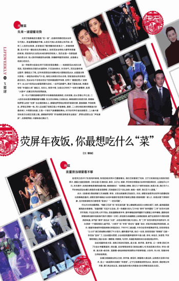 对父辈,春晚是过年的一道硬菜;对80后,春晚是除夕桌上必备的饺子;在90后看来,春晚变成了口味不一的调味品……不知道你最喜欢哪道“菜”? 开胃菜 先来一波甜蜜攻势 北京卫视春晚的主题是“在一起”,还请来李晨和范冰冰担任代言人,简直要甜齁的节奏。从担任代言人的消息公布开始,范李二人的同台表演,应该就成了最受瞩目的表演之一。李晨曾透露,在大年初一播出的北京台春晚上,他和范冰冰将给大家带来惊喜的表演。而说到与女友范冰冰的搭档另有其人,而且还是一位颜值颇高的男士时,有人笑问李晨是否会吃醋,李晨略带羞涩地回应,这是最让他放心的先生。 这一神秘男士的身份终于在彩排现场揭晓——他就是范冰冰的父亲范涛。范涛被粉丝形容为长腿男神,不仅身材修长,外形帅气,而且还曾经做过歌手,歌唱实力了得。近年来活跃在时尚舞台和大银幕的范冰冰,此番登台再次惊艳,一袭蓝色纱裙仙气十足。她和父亲首次同台合唱,范爸爸的台风和唱功颇见功力。范冰冰也不忘和坐在台下的李晨借歌声传情,在两个“最爱的男人”的陪伴下,台上台下的范冰冰都显得更为放松,一改平日的霸气,更多了温婉从容。李晨则带领“华谊四小虎”杨旭文、刘冬沁、梁译木等,为观众们带来了一场荷尔蒙爆表、极具“大黑牛”式硬汉风采的型男表演。 另一对人气情侣唐嫣和罗晋今年春晚将频频亮相,合体发糖。自从恋情公开之后,二人的互动总是充满着甜蜜与温馨,在北京台春晚上也是如此。春晚剧组也极具巧思,那幅她和罗晋儿时的“合影”也出现在舞台上,唐嫣和罗晋则全程双手紧紧交握,爱意满满,节目结尾处,罗晋还深情一吻。两人还加盟了湖南卫视小年夜春晚。据悉,二人将合唱经典对唱歌曲《你最珍贵》,不用想也知道,又是一个粉红气息爆棚的舞台。对于如何评价彼此的歌艺,二人毫不避讳地表示出相互欣赏之情。唐嫣崇拜罗晋“听他唱歌觉得是专业级的”,罗晋也回赞女友“声色清新”。这恩爱秀的,只能给他们满分了。 热菜 流量担当明星看不够 备受关注的2017央视鸡年春晚,彩排的相关照片已屡被曝光。我们已经看到了刘涛、王子文和蒋欣赴央视彩排的照片,搭配之前的消息称,《欢乐颂》五美刘涛、蒋欣、王子文、杨紫、乔欣将合唱歌曲《总有幸福在等你》,让剧粉开心不已。在五美中,刘涛的春晚表演经验最丰富。杨紫曾表示:“如果能上春晚,我们几个都听涛姐的,她是大姐,我们五个人平时参加活动去哪儿都是把衣服发到群里,问涛姐咱们五个怎么准备,她统一指挥,我们五个人跟着。” 此外,《伪装者》里的明家三兄弟胡歌、靳东、王凯也将献唱《风起时》。对此,胡歌在接受采访时早已透露收到央视春晚的邀约。胡歌在猴年春晚分会场中就跟许茹芸联手演绎过歌曲《相亲相爱一家人》,给观众留下深刻印象,这次的表演粉丝们都觉得“很放心”“一定没问题”。 作为2016年的霸屏剧,“明家三兄弟”和“欢乐颂五美”登上春晚舞台实在太合情合理了。当然,越来越紧跟潮流的央视春晚,“流量明星”可远不止这些。另一热播剧《老九门》中的“佛爷”陈伟霆和“二爷”张艺兴也将齐齐亮相,不过这次两人并不同台。因故遗憾缺席羊年、猴年春晚的陈伟霆终于如愿登上鸡年春晚,据悉他将深情独唱刘德华的经典代表作《爱你一万年》,新的面孔和编舞配上经典的旋律,赋予这首百听不厌的老歌新的味道。帅气的“佛爷”放如此“大招”,必定会俘获无数少女的心。而“二爷”张艺兴将和井柏然合作,同台表演一个超级萌的儿童节目,“小绵羊”和“井宝”组合与“童趣”结合,听起来丝毫没有违和感。此外,继猴年春晚带来歌曲串烧《幸福成长》,TFBOYS二度加盟,今年仍会带来歌舞类节目。在彩排现场“三小只”就已经给舞台增添了不少活力,暖热整场气氛。他们一出场,彩排现场的“阿姨粉”们就一秒变身“迷妹”了。主会场星光熠熠,分会场的明星阵容同样不容小觑,李玟、林俊杰、张信哲、平安等将亮相上海分会场一展歌喉;邓紫棋、马天宇、关晓彤亮相桂林分会场给观众拜年。 说起明星阵容方面,湖南卫视依旧强势。莫文蔚、陈乔恩、奚梦瑶、江一燕等《我们来了》的女神重聚甚欢;阿拉蕾、安吉等萌娃将在《爸爸去哪儿4》完结后首次同台;李玟+郎朗、莫文蔚+俞玖林、吴碧霞+廖佳琳等多组跨界合作新鲜有趣;大张伟、宋小宝、凤凰传奇也将纷纷亮相。 安徽卫视春晚也有王力宏、李宇春、萧亚轩、韩磊等大牌压阵,还将首次运用VR技术,呈上一桌颇具科技感的“年夜饭”。辽宁卫视春晚则有范冰冰、蔡依林、柳岩等女神齐聚,贾乃亮还和王迅、脸脸选择合唱大热歌曲《全世界都在说东北话》。 招牌菜 怀旧少不了,今年这组上 作为“春晚常青树”,曾多次登上央视春晚和东方卫视春晚舞台的蔡国庆今年则将再度亮相东方卫视春晚,还将与“金嗓歌王”费玉清“跨世纪同台”。同为妈妈辈的男神,如果说蔡国庆是歌坛的“常青树”,那费玉清则毫无疑问是歌坛的“不老松”,堪称难得一见的“跨世纪同台”。而《一剪梅》作为大众耳熟能详的经典,自然也成为两大歌坛不老男神的不二之选。据说,蔡国庆很早的时候就学唱过小哥费玉清的经典曲目,模仿起小哥来也是惟妙惟肖,连专属小哥的45度仰角“专治颈椎病”的经典动作也拿捏