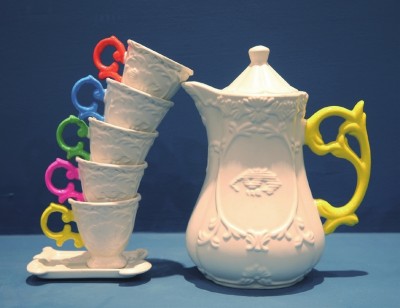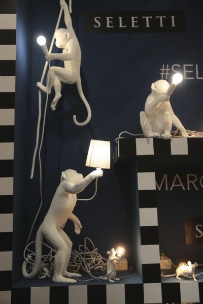 在一片色彩鲜艳的瓷器海洋中,“SELETTI”的产品尤其引人瞩目。这个来自意大利的品牌,展出的不少家具摆饰,其纹路和颜色都有些巴洛克纹饰的味道。去年他们推出的形态各异的猴子灯和老鼠灯,此次“大规模”涌入设计上海,充满戏谑和童趣的设计美。而餐具类乍一看只是觉得图案丰富、色彩艳丽,细细一品,才看到碟子被分为两个部分,一半的纹饰皆是欧式古典风格,另一半则是典型的中式意象,颇有水墨青花的意境。