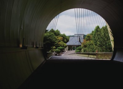 美术馆藏匿于距京都1小时车程的深山,四周云雾缭绕,只有穿过一条蜿蜒的隧道才能看见豁然开朗的场馆入口,与桃花源中描述的场景一致。200米的隧道和120米的桥,让整个参访路径变得相当戏剧化。在经历了蜿蜒的隧道,走到尽头,面前忽然开朗,玻璃屋顶的美秀美术馆就伫立在眼前。这种感觉使得进馆过程充满了仪式感,美术馆仿佛在说:来吧,让我们来一场凝神静气的旅行吧。