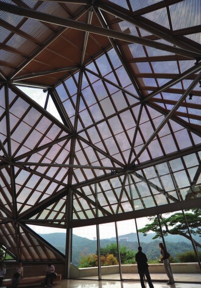 出于保护自然环境的考虑,日本的法律不容许太多的建筑物高高耸立于地面上。因此,贝聿铭选择把建筑80%的空间都藏到了地面之下。美术馆随之显得非常神秘低调。美术馆每一个部分均蕴藏着设计师打破传统的创新风格。由外型崭新的铝制框架及玻璃天幕,再配上 Magny Dori 石灰石及染色混凝土等暖色物料,以及度身设立的展览及存放装置,都充分表现出设计者匠心独运的心思。