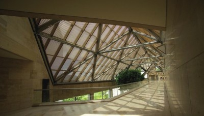屋顶使用的材质是玻璃,形状是最简单基本的几何图形——三角形。这源于贝聿铭一贯的理念,用最现代的材料和最简单的形状,也能诠释古老的、传统的意境。同时,“让光线来做设计”是贝聿铭的名言,他使用大面的玻璃,把自然光引进了室内。而格栅的设置,又使光线充满细节的变化。从入口大堂正面以借景方式眺望,开放的大自然充满活力地展开在我们面前。入口大门被称为通往世界稀有珍宝的“梦之门”,位于主要入口大门的圆形玻璃窗显现出自然及建筑物的亲和力。不断变化的光与影几何图案是美术馆最大的建筑特色之一。由于格栅的设置,天然光线产生了会随着一日不同时间,一年不同季节而变化出不同的光影图案。天窗极具一种高尚美,虽然是选用了不反光的玻璃,但运用的灯光仪器及展览范围内的天然光令它不能完全掩藏玻璃窗的方框。根据“用途是好的设计之主要元素”的理念,涂上深灰色或桃色的天窗,作用是令天然光更加扩散。因此,艺术品可以清晰地展示而不会反射耀眼的光线。入口大堂墙壁上的半透明灯罩及北馆大堂楼梯扶手旁的灯罩均是用西班牙的雪花膏石制成。点上美丽灯光的几何图案在明暗中泛出奇妙的质感。