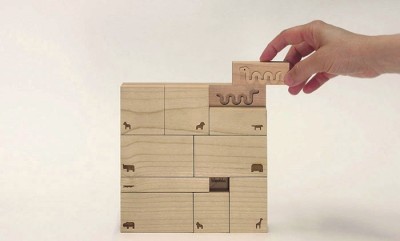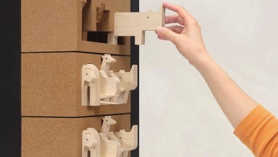 动物盒子的一侧,10种小动物将头探出中规中矩的方形盒子,形成一幅生机勃勃的丛林景象。每一种小动物都栖身在盒子内部的凹槽内,创造出探求虚实关系的三维迷宫。动物盒子采用天然材料,通过写实的形象呈现出一个生动的动物世界。