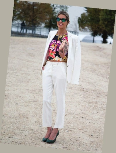 白色套装搭配彩色露脐装,小性感恰到好处。