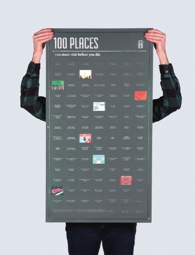 这张海报上列出了你无论如何也要去的100个地方,是不是非常期待?每去到一个地方,你就可以撕去海报上对应的一张贴纸。这时,你才会发现,下面原来有一幅艺术插画!当你游历过所有地方之后,这张海报就会摇身一变,成为一件超酷的装饰。
