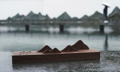 贝聿铭先生设计苏州博物馆新馆时,另辟蹊径地从米芾的山水画中汲取灵感。“山水间文具置物座”的设计灵感正是来源于贝先生创作苏州博物馆山水园时的乐趣与情怀。在这组片石假山的构思之初,贝聿铭先生拿着按比例缩小制成的小石片模型守在沙盘边,专注地摆弄堆砌心中的米式写意山水,以寻求最合适的大小比例及层次感。