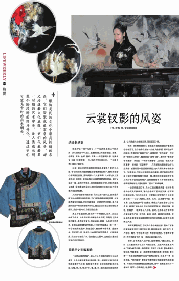 服饰是民族文化中最具性情的东西,它们凝聚成最家常的风景,却又浸透着文化底蕴。它们代表着某一时期的艺术审美,是人类成长到某个阶段时的精神外化,透过它们可望见古时的山水烟云。 结缘老绣衣 她是沪上一位平凡女子,不平凡之处是能以平民之资,日积月累达十年之久,收藏晚清以来的老绣衣、旗袍、老银饰、绣鞋、金钗、香炉、玉佩……然后翻阅古籍,结集成文,出版《云裳钗影》一书。她的名字叫吴沁江,一个出身书香门第的上海女子。 以前,吴沁江的祖母和外祖母都是富贵人家的大小姐,年轻时的照片是烫着鬈发穿着旗袍的样子。她欣赏祖辈们骨子里的优雅,更钦佩那一代大家闺秀,比如写过《上海生死劫》的郑念,觉得她有比古瓷更美更硬的灵魂。到了父母这一辈,虽然时代变迁,但母亲喜欢听评弹,父亲热爱舞文弄墨,受到熏染的吴沁江对中国传统文化和生活方式有着天生的亲切感。 从开始收藏老衣裳开始,吴沁江就一直认为,服饰是民族文化中最具性情的东西,它们凝聚成最家常的风景,却又浸透着文化底蕴。它们代表着某一时期的艺术审美,是人类成长到某个阶段时的精神外化,透过它们可望见古时的山水烟云。历史丰富灿烂,日子活色生香。 真正与收藏结缘,是因为一件老绣衣。起先,吴沁江纠结了很久,毕竟旧时绣衣保存很成问题,但是因为实在爱不释手,最终决定买下。自此以后,她就一头扎进了老绣衣、老饰品的收藏与研究里。100多件收藏品,她一件一件仔细地用纸包好,装进袋子,藏在樟木箱子里,避免氧化。因时间久远,其中不少衣裳已有污渍霉点,或脱线破损,完好如初的没几件。但在吴沁江看来,这些旧衣服和旧首饰仍然如同珍宝。 前朝历史如数家珍 “云想衣裳花想容”,吴沁江认为中国的服饰文化灿若星河,女子的服饰更是如花似锦。那一朝朝流光溢彩的服饰承载着时代之韵。每有朝代更替,这些衣饰便如花开花落,似梅、桃、荷、桂之于冬、春、夏、秋,报的是历史演变的消息,让人倍感人世悠悠无尽,而又历历分明。 然而,丝织物极易腐化,老衣服可能是收藏品中最难保存的东西了。它们的柔软细腻一如佳人的容颜,经不住岁月的蹉跎。商周时的“青青子衿”、战国时的“深衣胡服”、汉时的“锦绣十二章纹”、魏晋时的“披帛飞扬”、唐时的“慢束罗裙半露胸”、宋时的“一钩罗袜素蟾弯”、元时的“衣裳光彩照暮春”、明代的“花冠裙袄”……几乎都在光阴的移动下化尘而去,能留传至今且品相较好的大多只剩明清时的织物了。“触手碰去,已无法抚摸那远年的美艳。明代皇后的百子服只能在定陵的橱窗中惊鸿一瞥,清代的衣裳能留传下来且完好保存的也日渐稀少。这些美艳得不可方物的老绣比老银饰更耐不住岁月的浸泽。”吴沁江深感遗憾。 一边研究藏品旧衣,吴沁江通过翻阅典籍,也对中国服饰的历史如数家珍。清代的染织工艺空前发展,故而面料精细华丽。当时的丝织业,主要集中在官营的三大织造所在地——江宁(南京)、苏州、杭州。 《红楼梦》中的“贾不贾,白玉为堂金作马”的贾府,便曾三代袭官居于江宁织造府。难怪红楼中的女子衣饰皆花团簇锦,那些云锦、绸缎、软烟罗……精美得让人目眩。清时,还涌现出许 青黛多刺绣名家和著名产地,有苏绣、粤绣、湘绣、蜀绣和京绣等。宫廷造办处则指定精通刺绣的作坊定制袍服,以集各地刺绣之大成。 刺绣发展到清代,已成为女子必学的技能。吴沁江就曾收藏和鉴赏过不少清代的女服,其华美端雅、精工细作,令人惊叹。其中,有宫廷贵妇的、有官宦闺秀的、有富商女眷的,亦有巷陌女子的,每一件都让她欣喜不已。 清时,由于满族入主中原,服饰便有了满汉之分。那时,汉女服饰保持了上衣下裳的形制。上身大多是宽衣大袖,下身为裤子外系一条马面裙,足踏三寸金莲。整体看来分割线多,节奏感强,似一阙阙音韵优美的曲牌:醉花阴、喜迁莺……而旗女的袍服作为当今旗袍之始祖,则上下一体,线条流畅。“绰约旗袍”便描绘了清代旗女袍服演变为海派旗袍,再到当今时装旗袍的发展过程。而今,旗袍逐渐化作一座城市,甚至一个国家的文化符号。 旗袍间的古今穿越 对吴沁江来说,这些服饰虽旧,内涵却是鲜活的。旧时人们如何生活,看到它们,仿佛一下子历历在目。 她喜欢仔细地研读《红楼梦》,研究里面的人物穿戴的是什么样的服饰。比如写到贾宝玉下雪时穿了金雀裘,外面覆盖着一层孔雀羽毛,她当时心想:“这不保暖啊。再仔细一看,人家里面还有一层裘呢,是狐皮的!” 吴沁江收藏的一件红色纳纱底莲花鸥鹭氅衣堪称珍品。旗女氅衣大多都是缎面的,极少有纱料的。这件极薄的纳纱氅衣使用了艳丽的正红色,却因用料细致,和莲花鸥鹭的绣花而生出一种水灵灵的清凉感,定是夏季的着装。 红色是中国人最喜欢的颜色,汉人和旗人均不例外。每有喜庆大典,都要用红色。清时,皇帝朝服的颜色以黄色为主,以明黄为贵。但祭祀的礼服颜色分为:石青(蓝色)、明黄、大红、月白四种,其中明黄祭地、蓝色祭天、红色祭日、月色祭月。可以说是满族先民生存的自然环境决定了他们独特的审美取向。关外白雪皑皑、人迹稀少,对生命的存在、个体张扬的渴望,反映在旗人的服饰上就是用色丰富、强烈而明亮。 这件红色纳纱底莲花鸥鹭氅衣,“鸥鹭莲花”寓有一路连科之意,