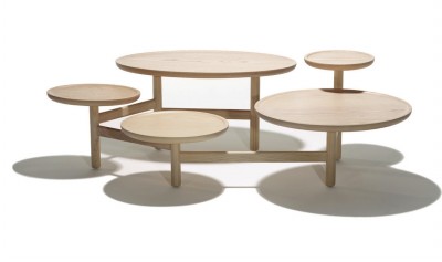 灵感来源于水中的浮萍,轻盈灵巧又充满了生机。打破传统的大桌面设计,大小错落的茶几面组合体现了别致的空间感,同时可让物品分类陈列于茶几上。