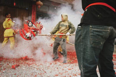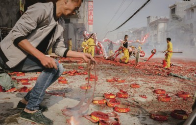 有时候一个不经意的巧合,成就了一张看似不一样的照片,处处充满了惊喜和不确定性,这就是我喜欢街头摄影的地方。 世界上有很多民族,各民族文化风土别具特色。在广西,这样的题材尤为丰富。小兵用自己特有的镜头语言致力于记录发生在他身边的、真实有趣的生活。这样的生活可能是美如画的地貌风景,这样的生活可能是街头集市的买卖,这样的风景可能是年节里一场热闹非凡的炮龙会。 小兵拍摄的民俗摄影强调真实性,画面内容所反映的民俗事物,是符合民俗真实和民俗规律形象的。但现实中的民俗事象,并非从任何角度、任何瞬间拍摄都能表达出它所固有的本质意义。这个民俗事象仅仅是饱含美好向往的生活吗?也许还不止这些。 所以用他自己的话说,“我觉得我拍到的,并不是炮龙本身。” Qa 护花小兵 摄影爱好者 Q:广西城市的街头拍摄,什么样的城市细节特别吸引你? A:我认为街头摄影中最吸引我的始终是“人”,其次才是他们所处的环境,我能做的就是用眼睛和相机,去记录这个场景中发生的一些有趣的瞬间,有时候一个普通的场景,一个很平常的动作,一个不经意的巧合,一个决定性的快门,成就了一张看似不一样的照片,处处充满了惊喜和不确定性,这就是我喜欢街头摄影的地方。 Q:炮龙的照片给人强烈的现场感,这是什么样的一个民俗活动? A:宾阳炮龙节是广西宾阳县独有的一种传统节日,是汉族、壮族文化融合共生的综合性民间节日。拍摄这组照片的同时,我觉得我体会到一种久违的“年味”。这是高岭镇的年初一炮龙会,场面非常热闹,而周边乡镇却逐渐冷清。很多人觉得现在过年年味越来越淡,普遍缺乏一种生活的仪式感,原本很多应该有的礼仪和仪式,在现如今变得越发随意,而这种随意,不都是从我们开始的吗?过年的仪式越来越精简,到最后连对过年的期许都精简掉了,才觉得丢了什么,唯一遗憾的是我因为有事在最热闹的时候回家了,其实烧得最厉害的时候,场面比图中厉害十倍都不止,其实说回来,遗憾并不算很大,因为我觉得拍到的,并不是炮龙本身。