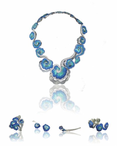 作品以工笔画中的“云纹”为基本图案,通过对云纹的变化进行梳理和设计,于首饰上表现工笔画的节奏韵律。整件作品采用不对称的形式,在珐琅的基础上运用了古老的点翠工艺,将翠鸟羽毛分层嵌入,比拟工笔画的层层晕染。