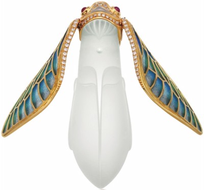而到了2014年,原本计划一年推一个新系列的苏洁锋却暂停了脚步,虽然当时新系列的3D效果都已经做出来了,但是他还是放弃了最后的生产。因为,他感觉到了孤独,当时中式珠宝的市场份额还很少,他需要停下来,回本溯源,寻找中式珠宝的核心所在。到了去年,苏洁锋再次出发,结合了珐琅工艺,用不同产地、不同大小的戈壁玉做出了蝴蝶胸针系列。因为玉石的天然性,无法做出完全对称的翅膀,苏洁锋就在后面衬了铜镜,配以竹叶、梅花、 兰花的图案。这样共生共存共灭的镜像效果,成就了物质与非物质之间的自由转换,照射出了自己,也收罗了大千世界的万象,真是胸针里头见乾坤啊!这也正是东方美学与中式珠宝的最大魅力所在吧,不同的角度可以欣赏、解读出不同的意境与哲学。