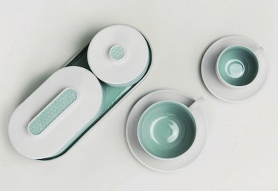设计师将液体飞溅的瞬间冻结在了这套瓷器作品之中,如同落在桌面的雨滴。金色的边缘薄如蝉翼,精确勾勒出了水滴的边缘,仿佛预示着自然现象的转瞬即逝,又像是反射的阳光,为作品镀上了一层温暖的色彩。