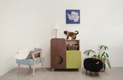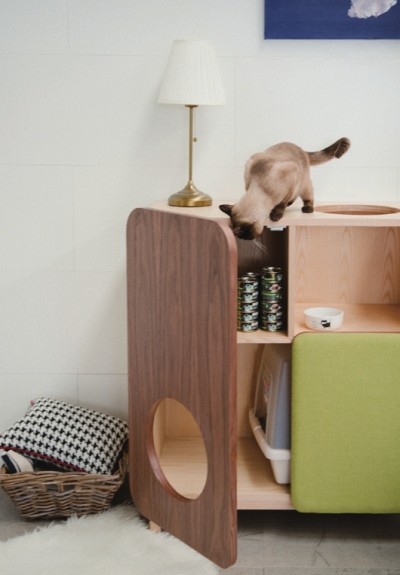 不管是活泼好动,还是慵懒的主子,都能在MEOW柜中舒坦地享受喵生!猫砂盆的存在再也不尴尬,可收纳于MEOW柜下方,一秒隐藏喵厕所!而可替换软包柜门是完美的猫抓板,柜门和顶部,则有供喵星人穿梭的门洞,让主子们舒适惬意。