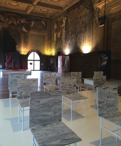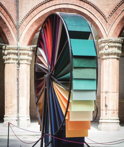 A:这次展览在博洛尼亚市政厅展出。博洛尼亚是一座文艺复兴的城市,文艺复兴代表着艺术的可持续。Alcantara提倡的“可持续”意味着创造、创意的复兴。所以两者之间有文艺复兴的共通点。博洛尼亚市政厅是一座13世纪的古老建筑,天花板和墙上的壁画代表着不同时期的历史,Alcantara与艺术家合作的作品代表着现在和未来,不同时期的艺术一层层叠加在这个空间里,象征的正是“可持续文艺复兴”。
