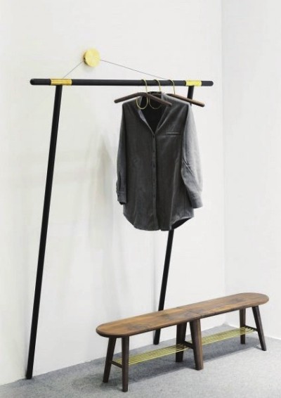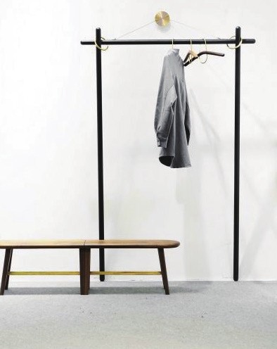 这个衣帽架在墙上只有一个装饰感极强固定点,一个黄铜的装饰勾,由此伸出两只“手”,将架身“抓捕”住。它没有底座,所以也不占用地面空间,全架身只有一个墙面金属支撑点,不用时还能方便将架子收起。