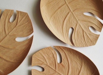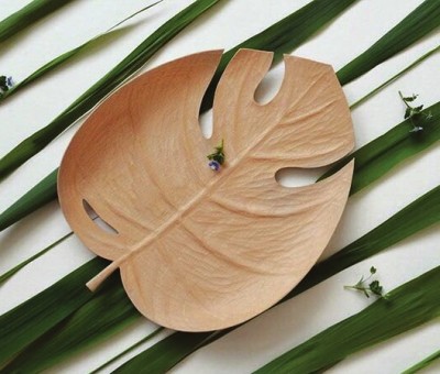 以各色植物的树叶为灵感的这一组作品,在细节处甚至能隐隐看见树叶的脉络,但是,它的“本体”却不是由树叶做成,而是以榉木为载体。蓬莱蕉叶的描摹,让这款木盘在清新自然之余,也透着一种别样的风情。