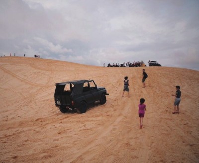 清新恬静中带着一丝狂野,美奈就像是一位美得无可奈何,又难自弃的少女。 美奈是位于越南东南部平顺省美奈半岛上的一个渔村小镇。关于美奈,说得最多的是它“一半是海水,一半是沙漠”的独特景致。“沙漠”与“水”这两种感官对立、难以统一的事物,在美奈竟能亲密无间、和谐共存。 赶海盛筵 从芽庄来到美奈已是傍晚,匆匆下榻酒店后,就赶往镇上的旅游集散地,预定第二天的行程。揽客的吉普车司机大多喜欢凑在一起,向游客们津津乐道美奈的日出和日落。在他们看来如果还能遇到渔民们赶海,那是极其幸运的事。捕鱼是大多数美奈人赖以生存的谋生手段。千百年来美奈的渔民仍然使用最原始的方式捕捞,工具甚至只是一个浴盆,里面铺着渔网,用朴实的勤劳,坚守着自己的本分。 这就好比了解一个美女,先要读懂她的心思。品味美奈,最好看一场赶海。 翌日,与前一晚相识的司机凌晨相约,天空就像黑色丝绒一般幽暗,稀稀拉拉的路灯让昏黄的灯光犹如轻纱,雾霭萦绕,一片朦胧。远近海边,影影绰绰的椰子树影,像是留恋月色夜景的游客。坐上吉普车,沿着海岸线一路奔驰,晨风将近半小时的洗礼将睡意彻底赶跑。刚适应黑暗的双眼,尚未在月光中分辨出方向,一阵腥臭的气息已随风潜入鼻腔。“渔村到了”,我们被带到了广袤平展的深褐色沙滩上。沙滩与陆地交界处,星罗密布着点点渔船,数量不可计。 天依然是灰蒙蒙的,东方的半空中远远地挂着一弯细瘦的冷月,有一颗星在月亮的左下方发出剑一般幽蓝的微光。可见几个戴着斗笠,包着面巾,面色黝黑的渔民正在整理网箱和竹篓,脸上除了颧骨处光亮亮的,其余部分都是沟壑纵横,似被海风吹皱的波浪。从其色彩鲜艳的衣裤推算,应该是几位女性。各自拎着一只小竹篓或套着脖子挂在胸前,或挎在手臂上,再手握一把小沙铲。此刻的沙滩,其实更像是一片泥洼地,脚踩上去冰冷粘乎,一沙铲挖下去,表面是湿润的流沙,再挖深一些,就能看到黑灰色的淤泥,周边的水透过沙层迅速渗透到坑里,一下子就灌满了。就这样一层一层地刮着,刮着,不多时,平整的湿沙地似乎露出一个生物,是蚌抑或是蟹。渔民麻利地用沙铲挑起就装到了手边的竹篓里。一会儿,他在泥洼地上一个直径大概手指粗的深坑挖下去,急急地挖了几铲,就看到一只缩成一团的小螃蟹,正慌乱地扒拉着泥沙,蓄势侍机逃走,在水漫过沙坑之前,渔民一手拎起那只小螃蟹丢到篓里。 天开始蒙蒙亮,已有零星的渔船开始返回,船上堆叠的是前一晚放下的网箱。 其余的人在岸边接过渔夫手中的网齐心协力地往上拉。几只小鱼小虾粘在网线上仍在殊死一搏,意欲挣脱逃生,最终依旧被一一逮住。没多久就装满了一桶品种丰富的海产,这是对一大早辛勤捕捞的渔民们的最好回报。 沙丘日出 东方微露了鱼肚白,司机吆喝我们赶快转场,莫错过壮美的白沙丘日出。渔村慢慢被疾驶的吉普车抛在了脑后,海面上迎面拂来的气息也逐渐由腥臭转为了腥湿甜润。当整个人都要酥软融化在这美妙惬意的海风里,远远地被吹走时,白沙丘已近在眼前。洁白的沙子,绵软细密;弧形的沙丘,一个接着一个,跌宕起伏;偶有低矮的树木,几丛绿草。那景致,竟是像极了西北边陲的鸣沙山。 脱了鞋,光着脚走在沙丘上,每一步惊起一抹细沙,每一步刻下一个脚印,就这样缓缓地向前走往上走。太阳,就要冉冉升起,喧哗声逐渐淡了。众人纷纷席地而坐,看着前方的天际。太阳穿过云层,复又潜入,如是几番,终如挣脱重重束缚般喷薄而出,霞光万丈。站在白沙滩制高点上眺望远方,满眼充满着温暖的橙黄色,连绵的沙丘在阳光下散发出魅惑的光芒,而沙丘之间的光影更加变幻无穷, 酷似金光闪闪、波涛汹涌的大海,波澜壮阔,胸怀顿然开阔。 百花齐放 美奈的10公里海岸分为西、中、东三个区域,在这三个不同的区域内你会发现不同档次与风格的酒店可以满足不同需求的游客。 西区就是指从Joe’s酒吧到高尔夫球场的海滩,在这个区域内各类豪华的度假村接两连三、鳞次栉比,沙滩上布满了风筝冲浪、帆板及航海俱乐部,各类银行、商店、餐厅、SPA比比皆是,除了常规的日间活动以外,这个区域的夜生活也是丰富多彩,当然与之相伴的自然是消费价格的高昂。 中区则是指从Joe’s酒吧到当地小集市的这段区间,在这个区域内最显著的标志就是公路两旁高耸的椰子树。你当然可以花掉一个上午的时间悠哉悠哉地从西区逛到这里,但请一定要小心高耸的椰子树有可能会在你全无准备的情况下就抛下一颗硕大的椰子来。中区也是众多背包客旅店与别具情调的海鲜烧烤摊密集之地,不足之处是这个区域内没有什么像样的沙滩,只有沿海的防波堤。 东区就是小集市一直蔓延至渔村的部分。渔村处处弥漫着鱼露独特的腥臭味道,虽然刺鼻却也让你有种暂时回归乡野生活的惬意。东区的沙滩当然就不能有什么指望了,因为这里的渔业生产除了腥臭的味道以外还会留下一片狼藉的沙滩。清晨来东区拍摄赶海渔民的劳作是一个不错选择。 Tips 红沙滩 红沙滩也叫黄沙滩,距离大海较近,在一边是海,一边是沙漠的美奈,层层叠叠形成了多种色带,最有特色的是红沙滩。虽没有白沙滩壮观,但是红沙滩是观赏夕阳的绝好位置。挑一个高处坐下,看着夕阳渐渐地西沉,映红了半个天际,紫色的晚霞与棕红色的沙滩在落日余晖的笼罩下