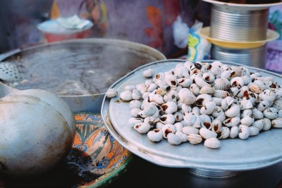 而让梅迪印象最深刻的,莫过于摩洛哥传统而著名的当地美食——蜗牛。在摩洛哥的大街小巷里,常常能够看到很多卖煮蜗牛的小摊,而且每一家的味道,都会有细微的差别。这些小摊通常有一个大锅,锅里盛满着用香料熬制而成的汤底,翻腾着许多蜗牛,这样煮成的汤料,有一种独特的药材香气。看见有客人光临,摊主人就会递给客人一个小碗,在小碗里盛上半碗汤,再来上满满一碗的蜗牛,然后客人就可以坐在一边慢慢享用这道极具异国风味的小食了:“其实,它的吃法有一点像螺丝,但蜗牛的口感远比螺蛳鲜嫩多汁。”