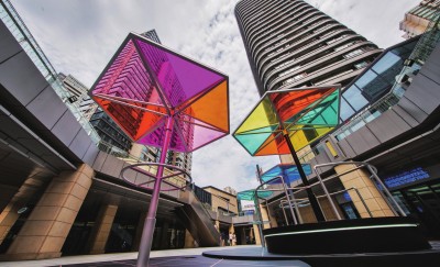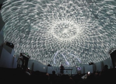 近年来,各类艺术展览频频在朋友圈刷屏,除了“好看、好玩”之外,“好拍”也成了年轻人们选择休闲去处的标准之一。前阵子,“城会玩”们又纷纷把镜头对准了瑞虹天地月亮湾的顶楼,原来在月光露台上悄悄搭建起一个巨型的球形装置,看上去就好像半个罩在楼顶的蛋壳。通过一扇旋转门走进球内,你会发现内部是一个球形穹顶结构,中间则放置着另一个结构感十足的大型LED网格球。在黑暗的笼罩下,一切显得神秘又未知。这整个巨型球体空间,其实是由法国电子音乐创作家Eric Raynaud与可视化实现设计师Louis-Philippe St Arnault等艺术家共同完成的球形互动装置——Entropia。随着夜幕降临,人们躲进大球里,艺术家则用特定的程序调节现场立体环绕音效、酷炫的灯光和360度全方位光影特效,营造出了一个超现实的世界,万千星空仿佛触手可及。原本漆黑空洞的圆形空间,随着强劲的音乐声响起,中间的几何形大球开始闪烁光芒,无数光束奔涌而出,光影随着节奏变幻。置身Entropia内,用手机就可以轻易拍出带感的朋友圈摄影作品。