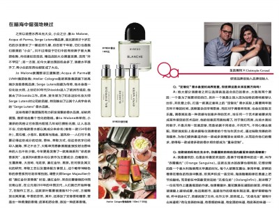 A:我最喜欢的,也是全球最受欢迎的,是基于柑橘香味的这一款,叫作“赤霞橘光”(Orange Sanguine)。这款古龙水的故事也很特别,它想诠释的是一个意大利海傍周末早晨的时光。每个人都聚在露台,享用早餐,新鲜的橙香在橙色的热浪中飘扬,欢笑声织成一曲交响,海浪随着韵律在悬崖上把节拍敲响。而目前在中国最受欢迎的“无极乌龙”(OolangInfini),则诠释了一位在写作上遭遇瓶颈的作家。他望着窗外,雪花飘落在凝固的湖面,呼吸在玻璃窗上凝结成雾,他远离都市,追逐创作的思绪来到这里。壁炉里噼啪作响,杯中的冰化了,灵感找到了方向,化作文字,跃然纸上。“无极乌龙”里有什么味道呢?有乌龙茶的味道,有香烟的味道,有金酒的味道,有皮革的味道……