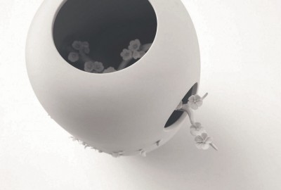 这支花瓶由Sèvres的陶瓷艺术家制作,他们继承了公司超过275年的历史传统,在狭小的空间中完成了这一令人惊叹的细腻工作。花瓶上开有一个圆洞,里面仿佛生长着一株樱花树,一簇樱花从中款款伸出,盛开的枝条穿墙而出,盈满春意。
