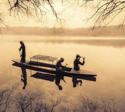 烟雨朦胧中,现代感的雕塑和建筑包含明显的杭州元素