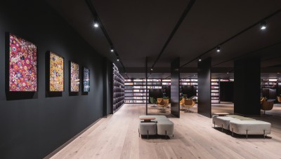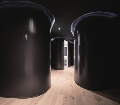 作为主角的大台阶,使得上下两层自然连接,融为一体。除了涌动的人流,还有令人惊喜的意外:美妙的光线随着大台阶从室外进入下层,仿佛瀑布倾泻而下。在这里,俞挺同样采用了建筑学中的新形式——对偶。既然上层是轻快、自然的,那么下层就是沉静、厚重的。俞挺用大面积的黑色削弱了活跃度,并在两翼进一步用黑色和灯光营造出更加私人化、冥想化的神秘意境。在这样的下层空间里,交往的需求被降低,更助于居民们静下心来专注阅读或者欣赏艺术。