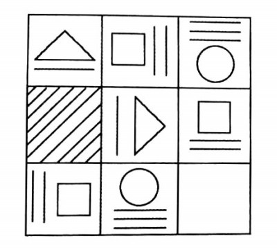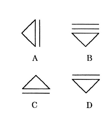 在某个小镇,有这样几个转向标志,它们之间汇总在一起后,因为各自不同的规律而呈现出一个具有逻辑性的图案,这个图案还缺一个角,下边的哪一个是它缺失的呢?