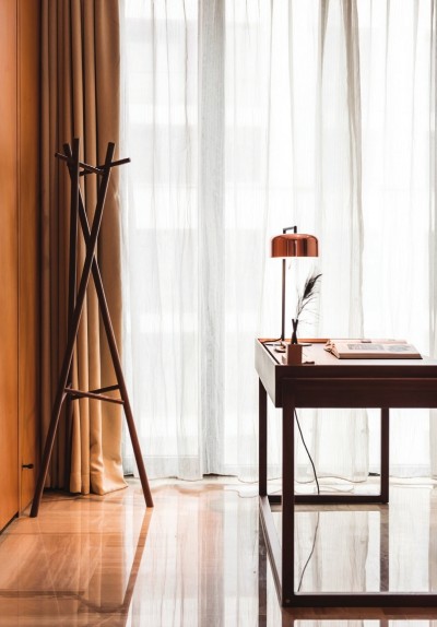 正因书房是开放式设计,一张能给人以专属领域感的书桌显得尤为必要。团队用三面围合的砚台书桌作为主体家具,搭配同样具有围合感的蹼椅,充分营造了家庭办公氛围。
