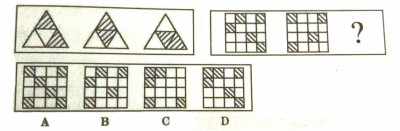 妈妈有很多条格子头巾,小灿发现,这些头巾上的格子排列竟然隐含着某种规律,她分别展开三角形的头巾和方形的头巾,可是在最后一块方形头巾这里找不到符合规律的了,究竟哪个是应该在问号处的头巾呢?