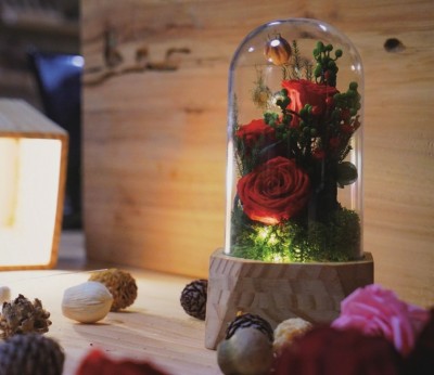 以《小王子》中小王子与玫瑰的故事为原型,取故事中简朴童趣的玫瑰花玻璃罩造型,精选来自澳大利亚的玫瑰永生花和易乐木艺设计的原木灯台,聘请资深的花艺师进行指导制作。