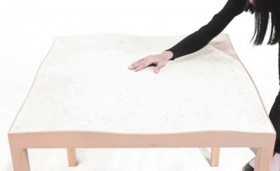 废弃的纸浆经过固化处理成为坚固材质,达到板材的强度。改变了属性的纸桌面代替了木制桌面,形态柔软而坚固。它同时还为睡觉小憩设置,桌面曲线符合人体工程学的曲度变化,适合人体趴靠在桌面上的体态轮廓。